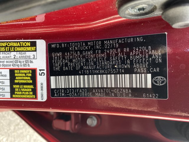 - VIN : 4T1B11HK8KU755714